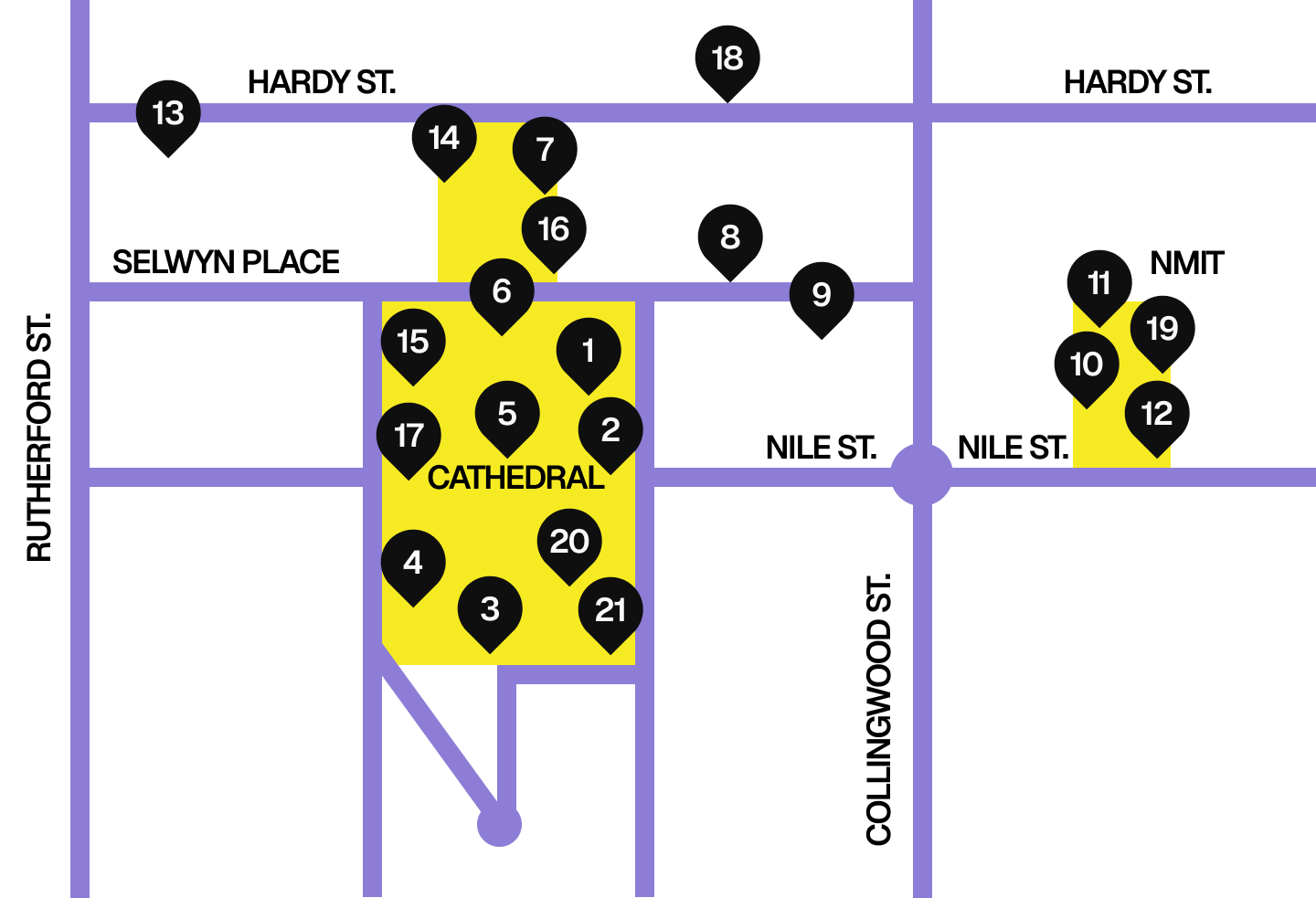 Subtle lights and pathways weave through the gardens and NMIT, connecting spaces with gentle illumination.