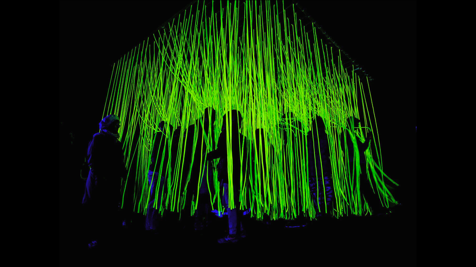 A tangled web of glowing neon tubes creates an otherworldly spaghetti of light outside the museum.