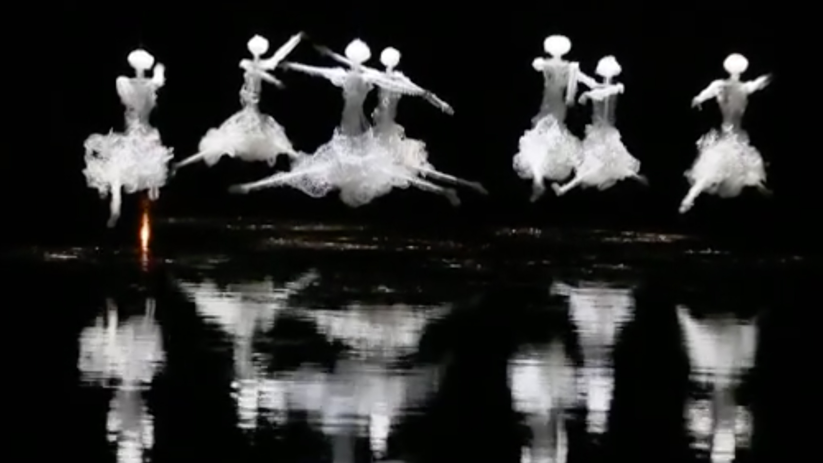 Ethereal illuminated figures float gracefully above, creating a haunting and beautiful spectacle.